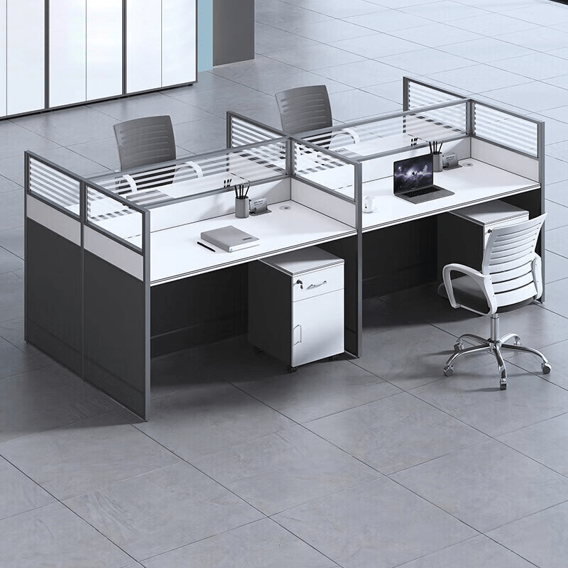 This workstation suits corporate offices, co-working hubs, call centers, and training centers. Its black-and-white design complements various office interiors while supporting collaborative and efficient work setups.