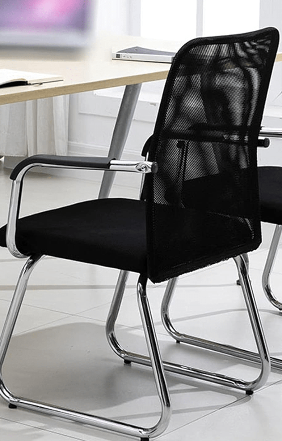 The chair features a slightly contoured backrest to support the natural curve of the spine. The padded seat provides additional comfort, reducing fatigue during longer meetings or waiting periods. Its thoughtful design promotes proper posture for visitors, ensuring both comfort and professionalism.