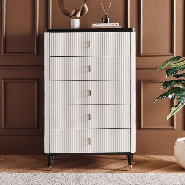 This chest balances elegance, durability, and practicality. It provides organized storage while enhancing interior décor. The elegant chest of 5-drawers delivers a stylish, reliable, and versatile storage solution for modern spaces.
